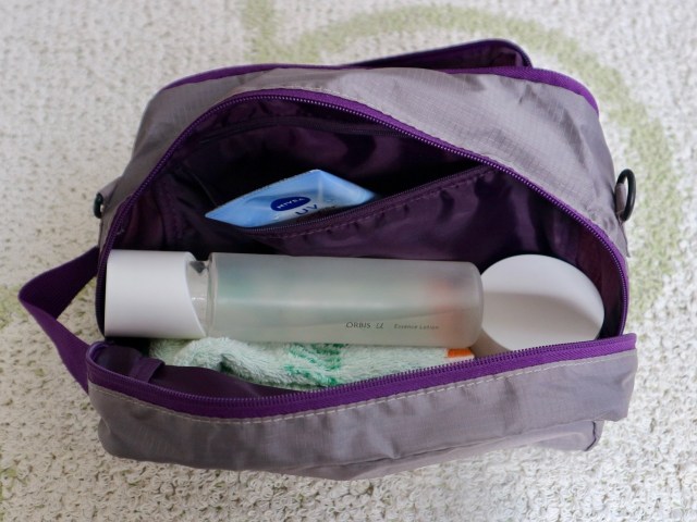 いっぽう後方の収納スペースはマチが広いので、化粧水や乳液、ハンドタオルや日焼け止めクリームなど少しかさばるものを入れてみたところ……。