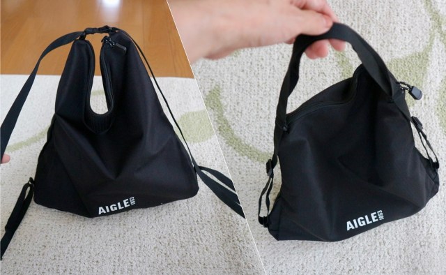ナップサックとしてだけでなく、ストラップをギューッと引っ張るだけでトートバッグになるのも便利です。