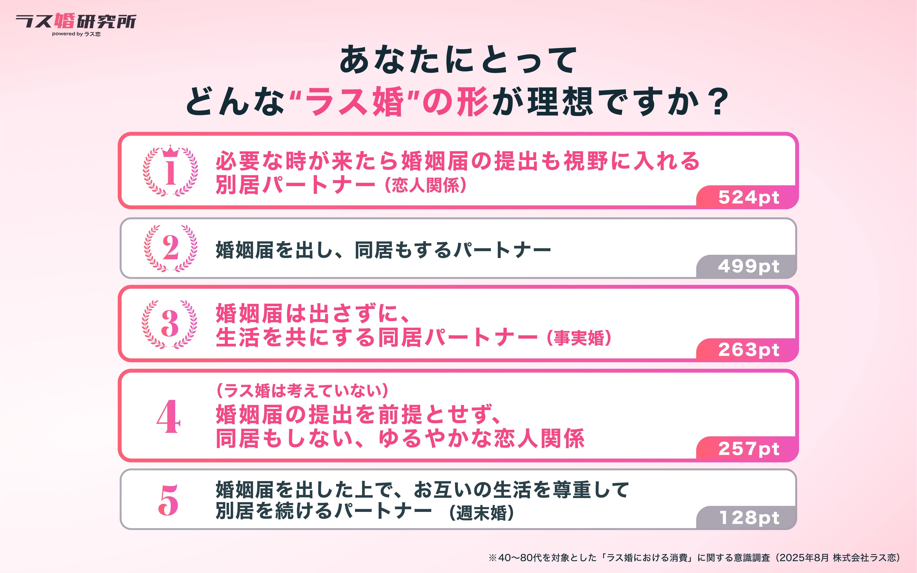 また年代別で見てみると、40代は「婚姻届あり・同居」といった従来のかたちにこだわる傾向があるけれど、70代以上においては「同居なし・ゆるやかな恋人関係」を望む人が4割超もいたんですって。