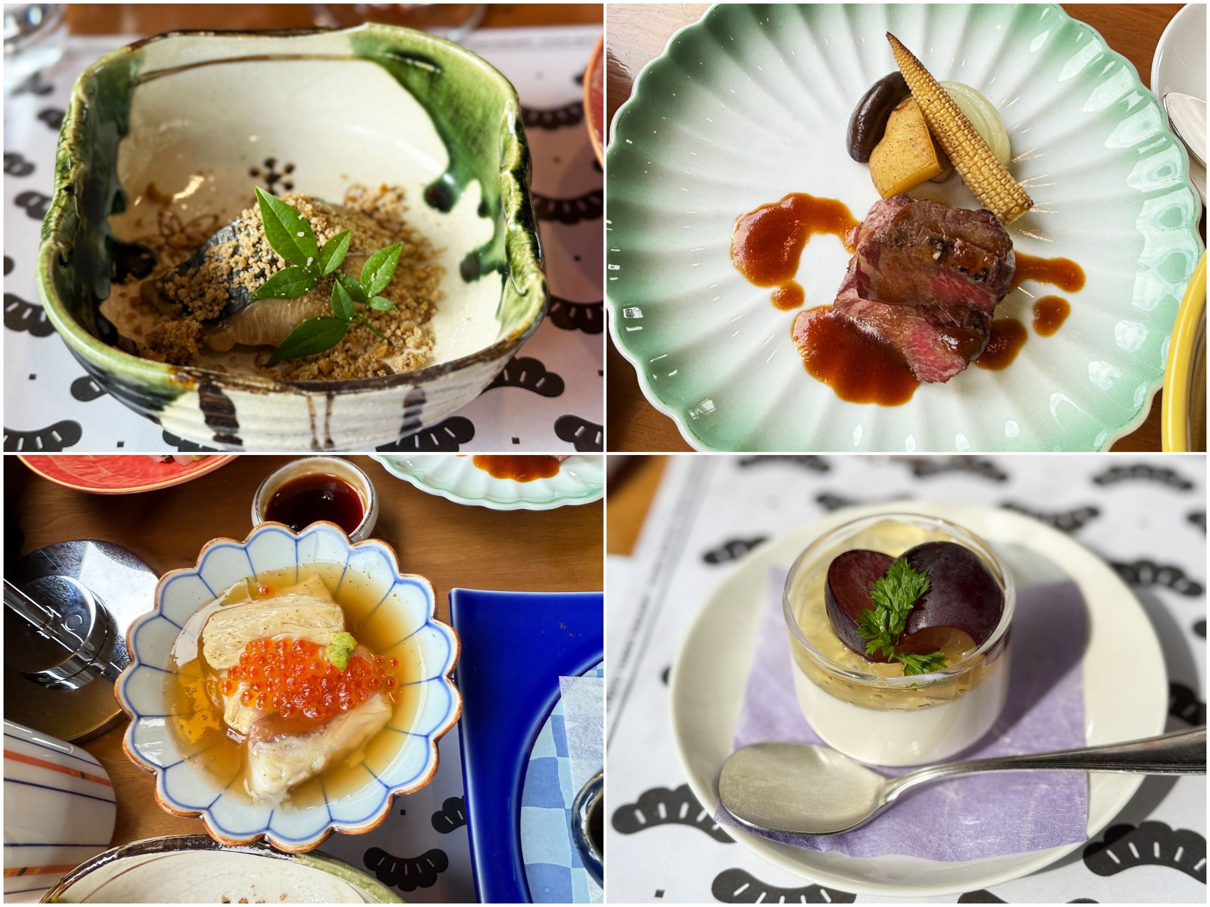 その後も幽庵焼きに東寺蒸し、「琥珀和牛」のステーキと、地元食材を使った京都らしいお料理を次々にいただけます。どれも盛り付けや器まで凝っていて、提供されるたびにわ〜っと声が出ちゃう。