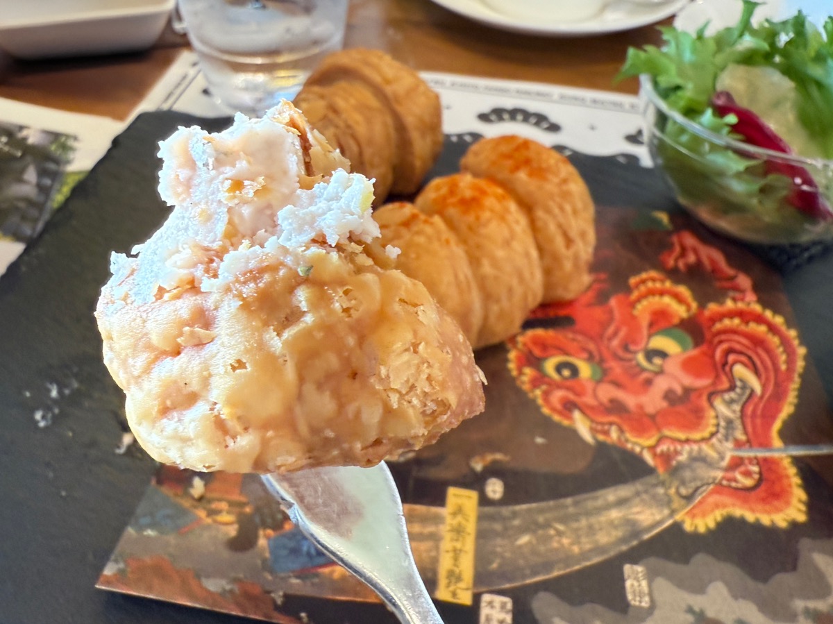 プロデュースは、1970年創業・地元食材にこだわる「パティスリーカフェ・カタシマ」。1皿目の「大江山酒呑退治プレート」には「鬼のこん棒パイコルネ」や「鬼ババァと菊芋のポタージュ」など。鬼ババァて!となりますが、大江町の名物どぶろくの名前なんですって。