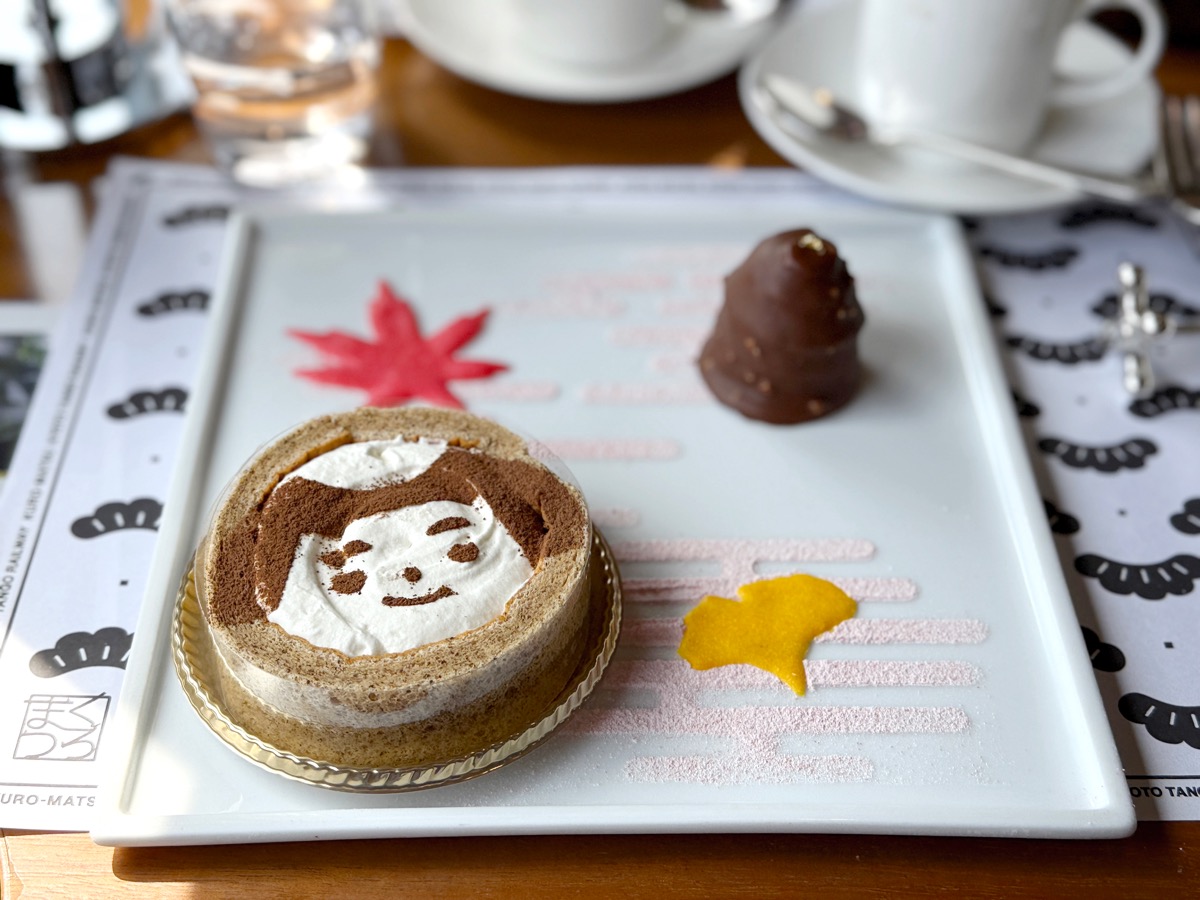 2皿目「大江山デザートプレート」もこれまた絶品ぞろい。金太郎プレミアムロール、め〜っちゃ可愛い! 老舗「山城屋茶舗」が焙煎する赤鬼ほうじ茶を練りこんだ一品で、お茶の香りがしっかりと感じられます。