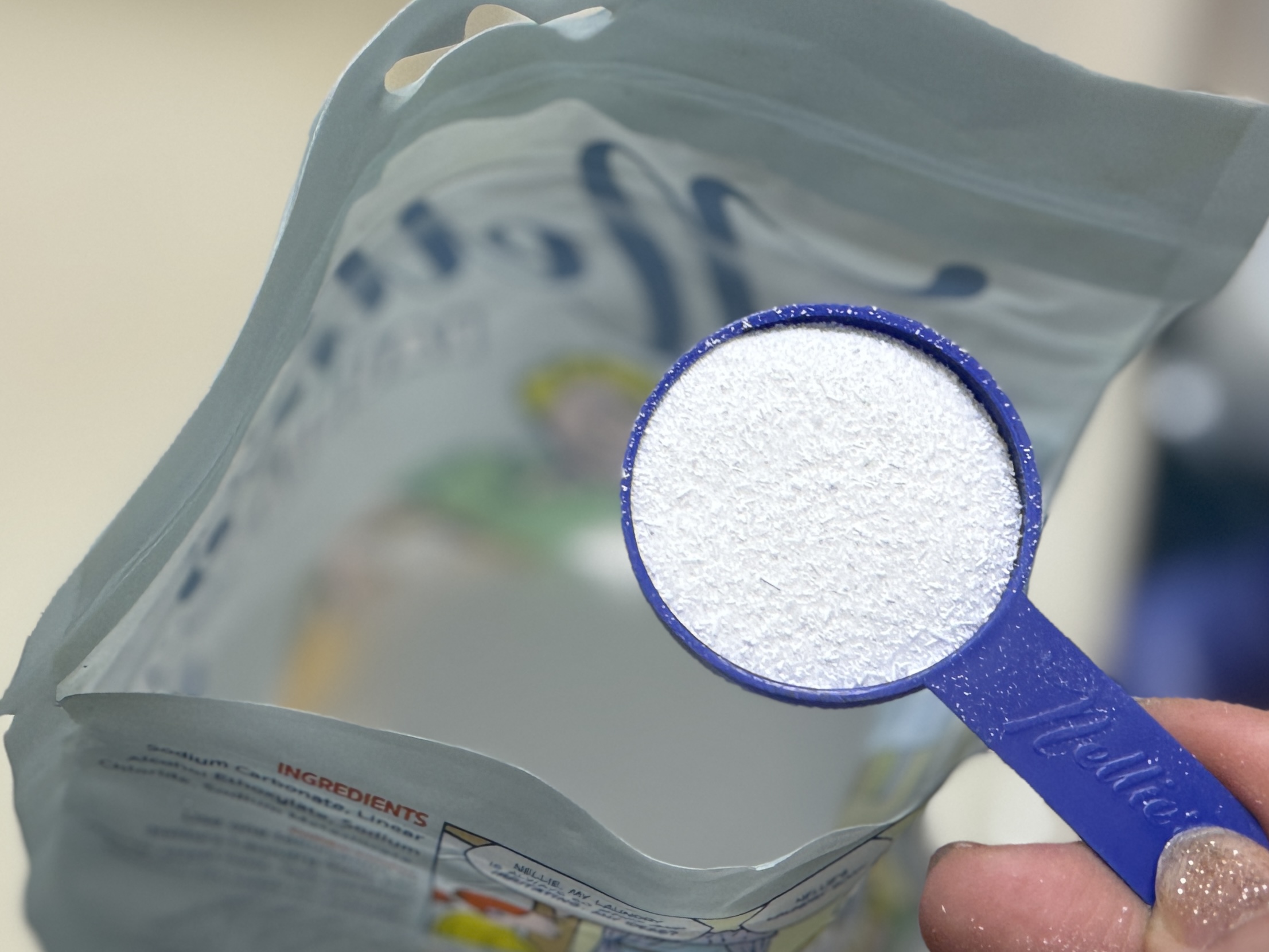 「ネリーの洗剤や!冷たい水でも溶けるし新品みたいにフワフワなるで。使こてみ!無香料や」