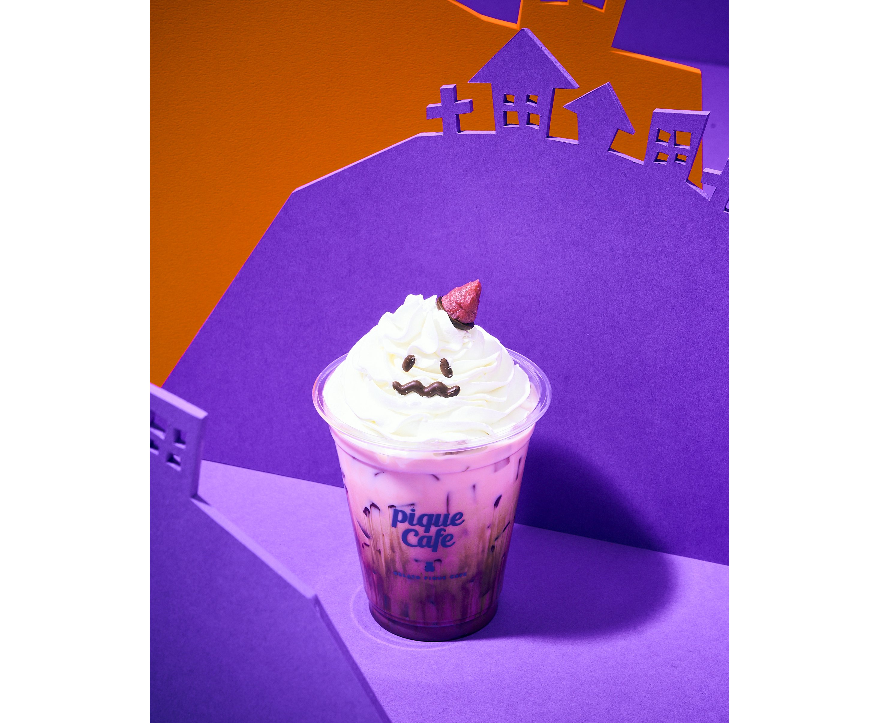 紫芋シロップとミルクが混ざり合うゴーストラテ。チョコレートソース×ふんわり泡立てたエスプーマでゴーストを再現しているんだって!