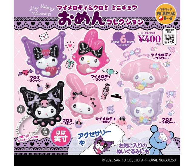 実際のおめんを忠実に再現した「おめんコレクション」に、「ゴシック」「リボン」「フラワー」の3つのテーマに合わせたマイメロディ&クロミデザインが新登場!