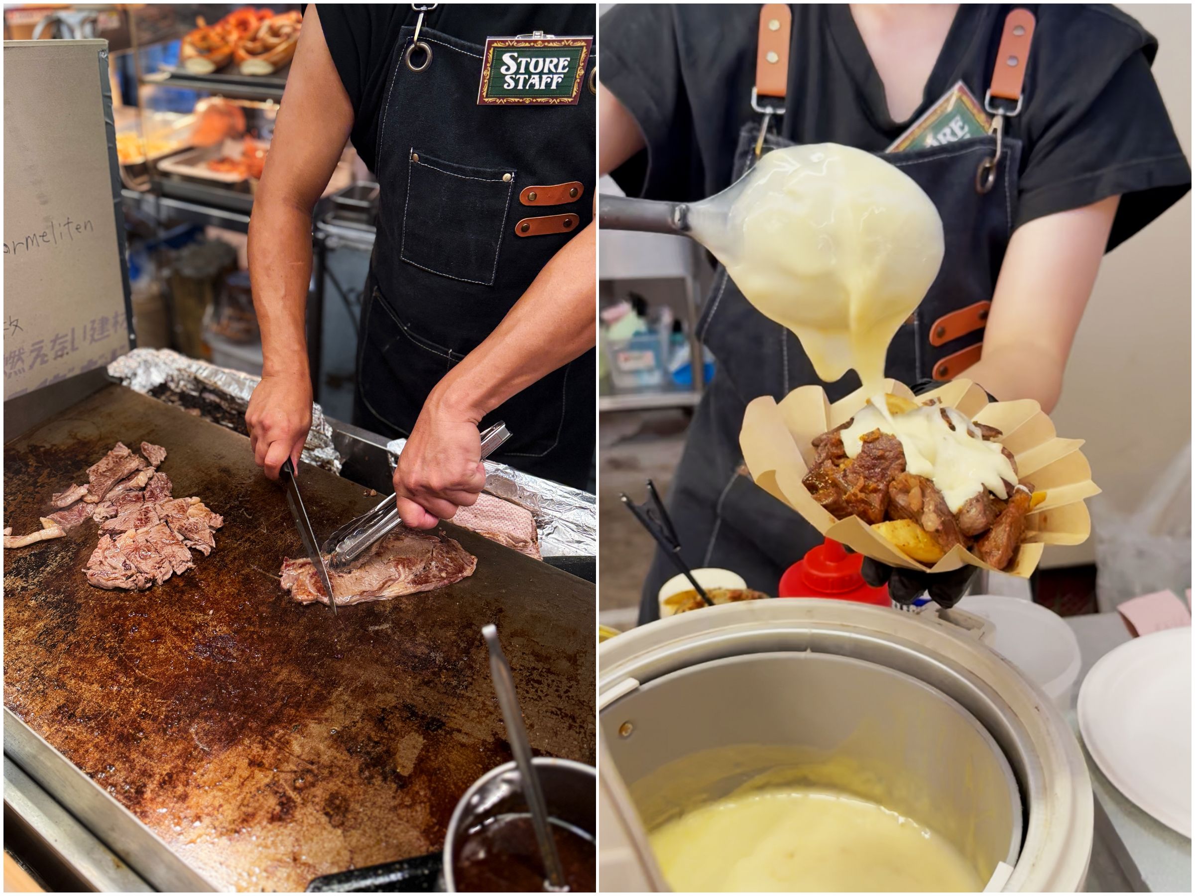 大型テント内DER HIRSCHBRAUの「【復刻】焼きたてステーキ トリプルチーズがけ」レギュラーサイズ(1500円)を注文しました。目の前で鉄板で焼き上げたステーキに、とろけるチーズをた〜っぷりかけてくれます♡