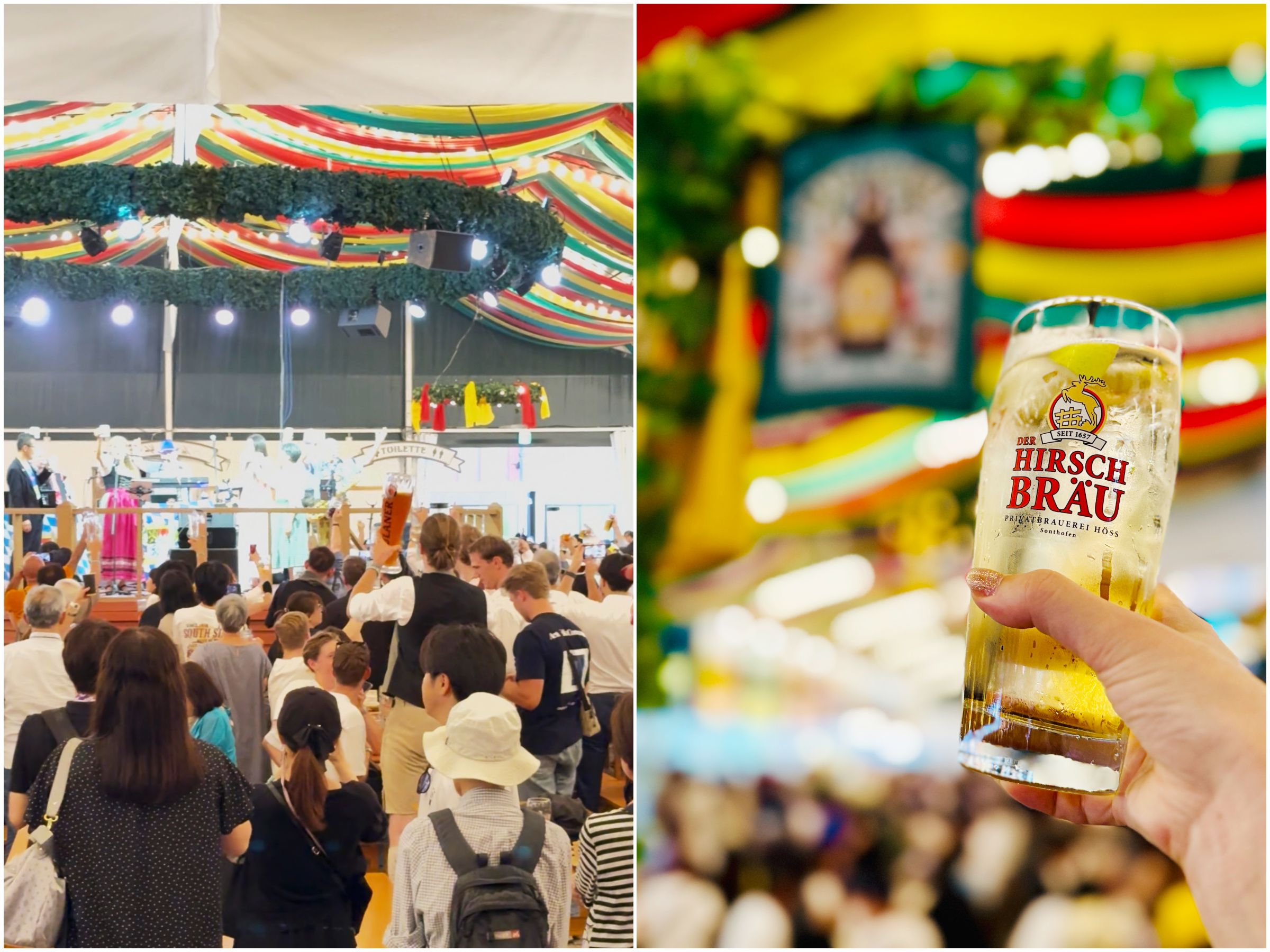 大型テントは、カラフルな装飾の下にビールブースと客席がずらりと並んでものすごい熱気。この日は初日だったのですが、平日16時前にも関わらずお客さんはいっぱい! 外国人の方も多く、あちらこちらからドイツ語で乾杯のかけ声が聞こえてきます。