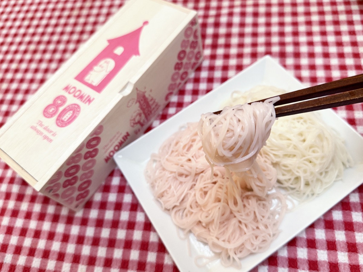 楽天の公式ムーミンショップで購入したのは【公式店限定】 MOOMIN ムーミン80周年記念 手延べ三輪そうめん 9束入り ピンク さくら(2268円)。