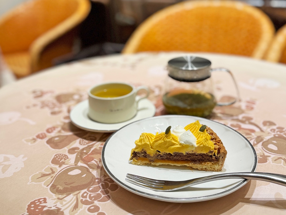 くりりんかぼちゃペーストとチョコレートスフレをじっくりと焼き上げているそう。いただいてみるとクリームは想像以上になめらか、いっぽうでチョコレートスフレにはナッツが隠れていてザクザクとした食感も楽しめます。