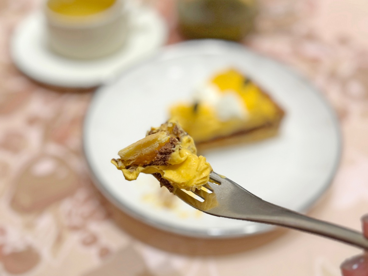 味のメインは、濃厚な白ごまブランマンジェ。そこに黒蜜の甘みが重なり、クルミや白玉、黒洲きな粉などが合わさって、タルトでありながら和を感じる味わい。最っ高のお月見スイーツに出会っちゃったかもしんない。