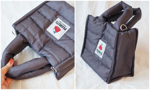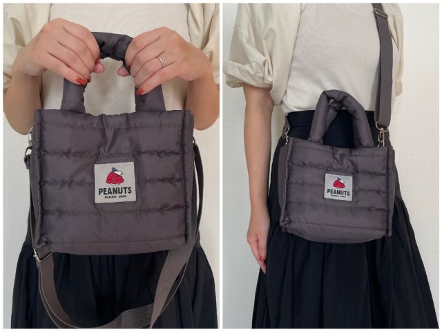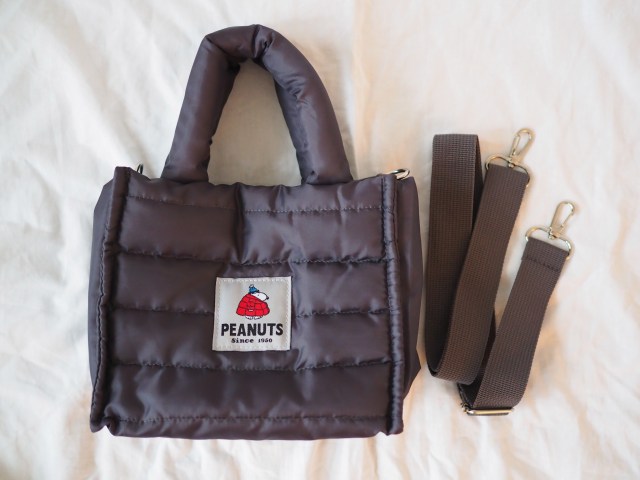 チャコールグレーのシックなキルティングバッグの中央には、スヌーピーの刺繍タグがアクセントになっているのですが……バッグと同じようにボリューミーなダウンジャケットを着た姿がかわいすぎる!