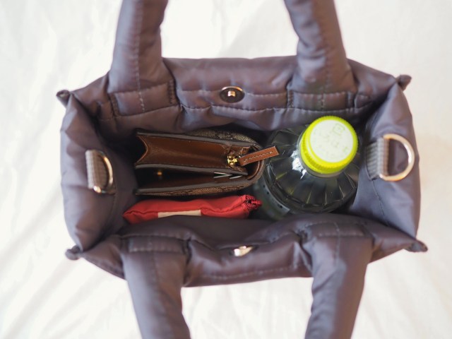 コンパクトな見た目も魅力のひとつなのですが、中にはお財布、ミニポーチ、350mlペットボトルといった必要最低限の荷物は収納OK。