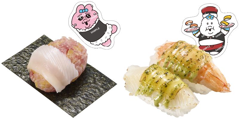 10月8日からの前半には、おぱんちゅうさぎのコラボ限定ピック(全10種)が付く「まぐたくおはぎ(イカのせ)」。10月22日からの後半には、んぽちゃむ&きみまろのコラボ限定ピック(全10種)が付く「いかとえびのバジルチーズ゙炙り」が登場します。