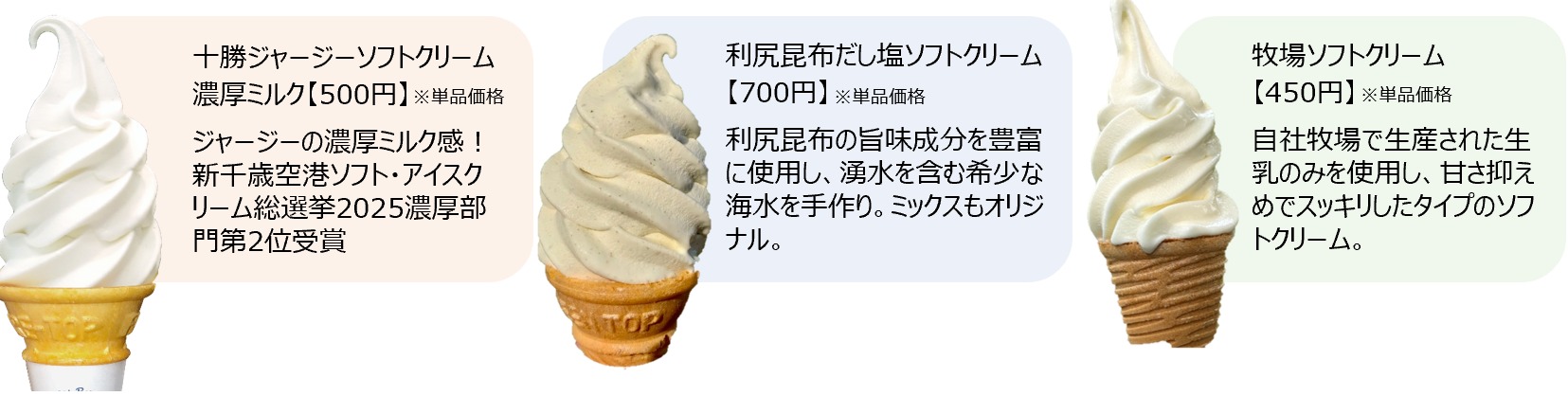 「十勝ジャージーソフトクリーム」「牧場ソフトクリーム」「利尻昆布だし塩ソフトクリーム」(!)など、個性あふれるメニューが勢ぞろいしているよう。さてさて、どれにしましょうかね?