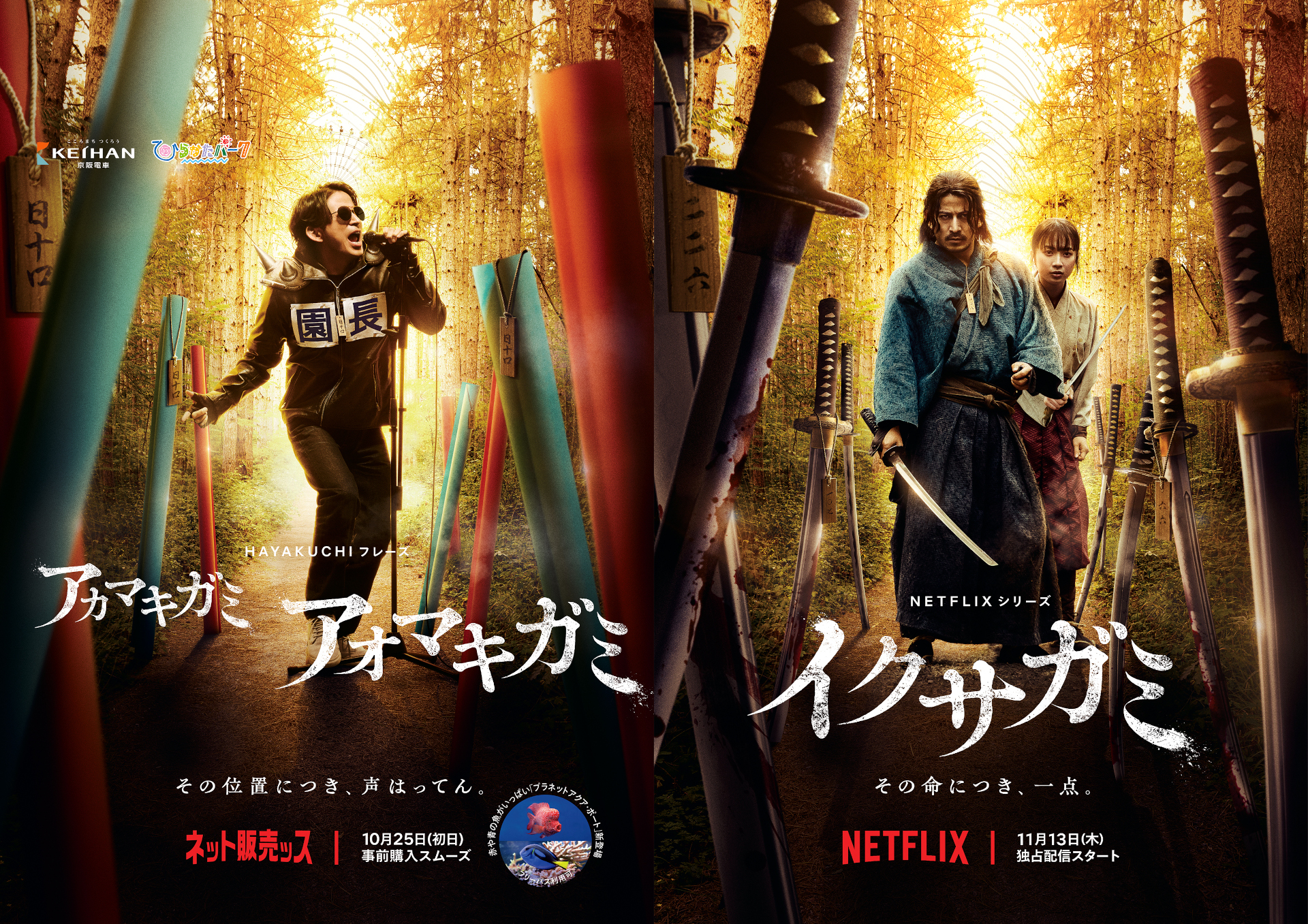 新作ポスターは、京阪電車の沿線を中心に2025年10月10日より掲出予定です。ひらかたパーク公式サイトでは、園長による早口言葉ボイス「アカマキガミ アオマキガミ イクサガミ」も聞けちゃいますよ~!