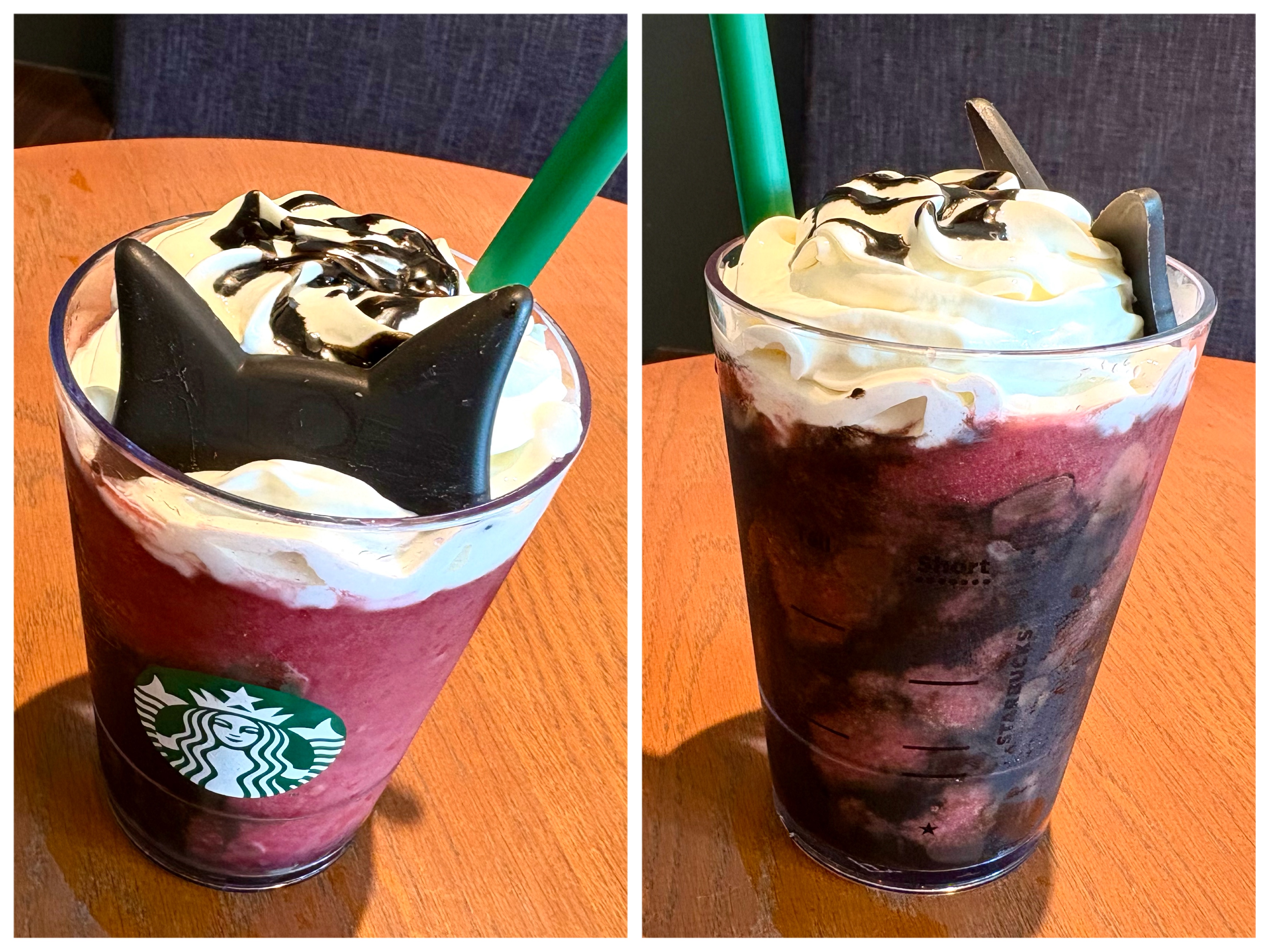 ハロウィンらしい妖しげな色味のフラペチーノの上に、真っ黒な猫の耳がひょっこりとのぞいている、スタバの「アサイー ベリー フラペチーノ」。