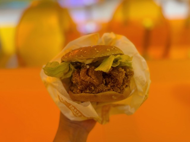 まずはそのボリュームにビックリ! シングルサイズなのですが、てっきりダブルサイズのバーガーかと思うほどのボリュームです。フライドチキンはザクザク食感の衣とジューシーな鶏もも肉のコンビネーションがたまらないっ! 生の玉ねぎやレタス、酸味のあるピクルスがたっぷり入っているので、くどさを感じずに最後まで食べられます。