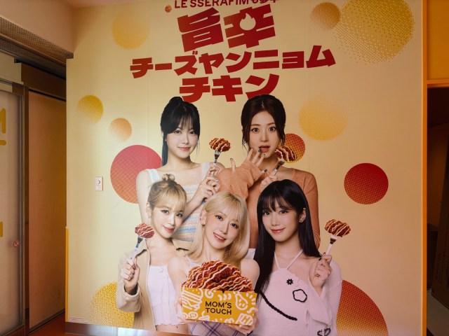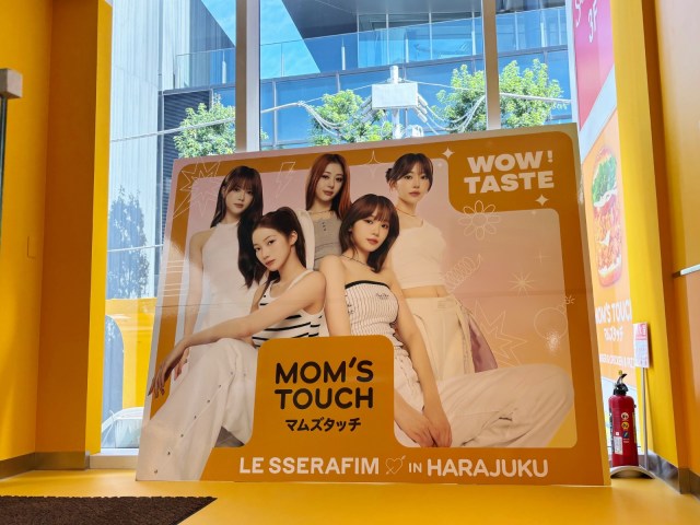 マムズタッチは、韓国内で最多店舗数を有するバーガー・チキンブランド。現在は5人組ガールズグループ「LE SSERAFIM(ルセラフィム)」がアンバサダーを務めていることから、原宿店でもメンバーたちが並んだ写真がお出迎えしてくれます。