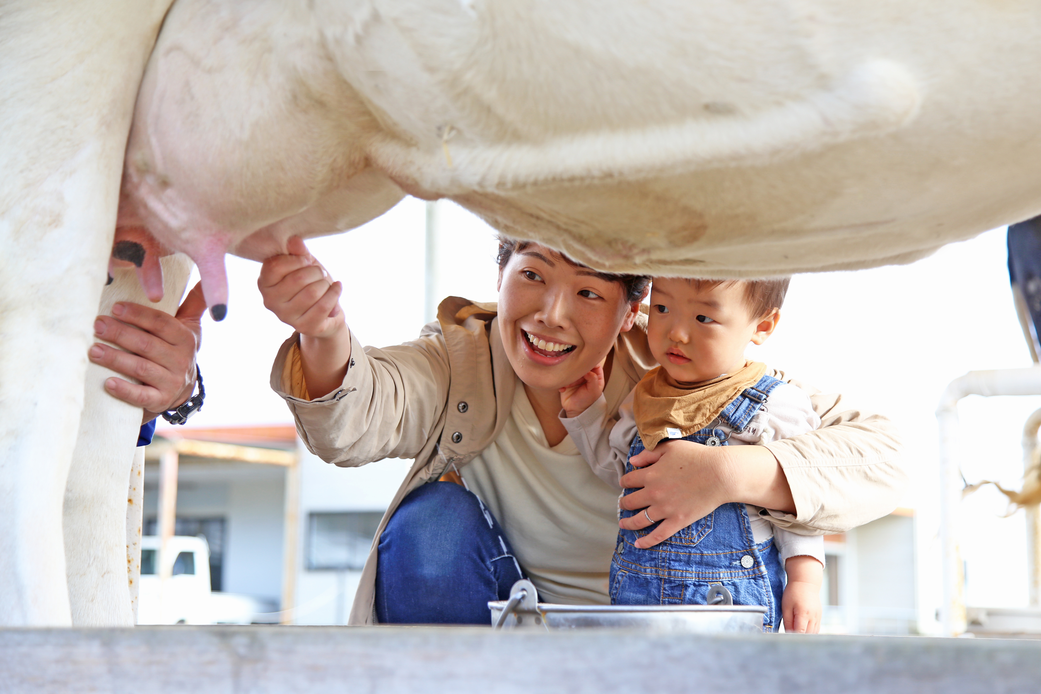 澄んだ空気のなかで、草の香りや牛の鳴き声などを感じながらリラックス。動物たちがのんびりと過ごしている様子を眺めながら「乳牛の手しぼり」を体験! これぞ究極の癒やしかも。