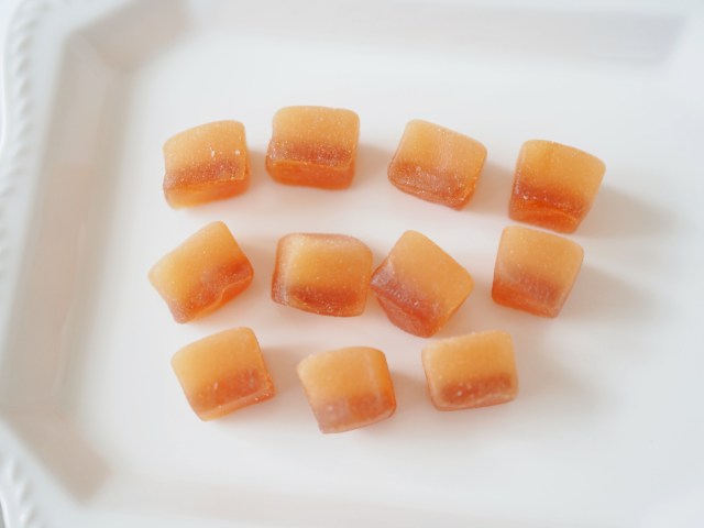 グミはきな粉の層と黒蜜の層の2層構造になっていて、琥珀色の見た目が和菓子のような趣です。ちんまりした小さめサイズがまたかわいいんですよ。