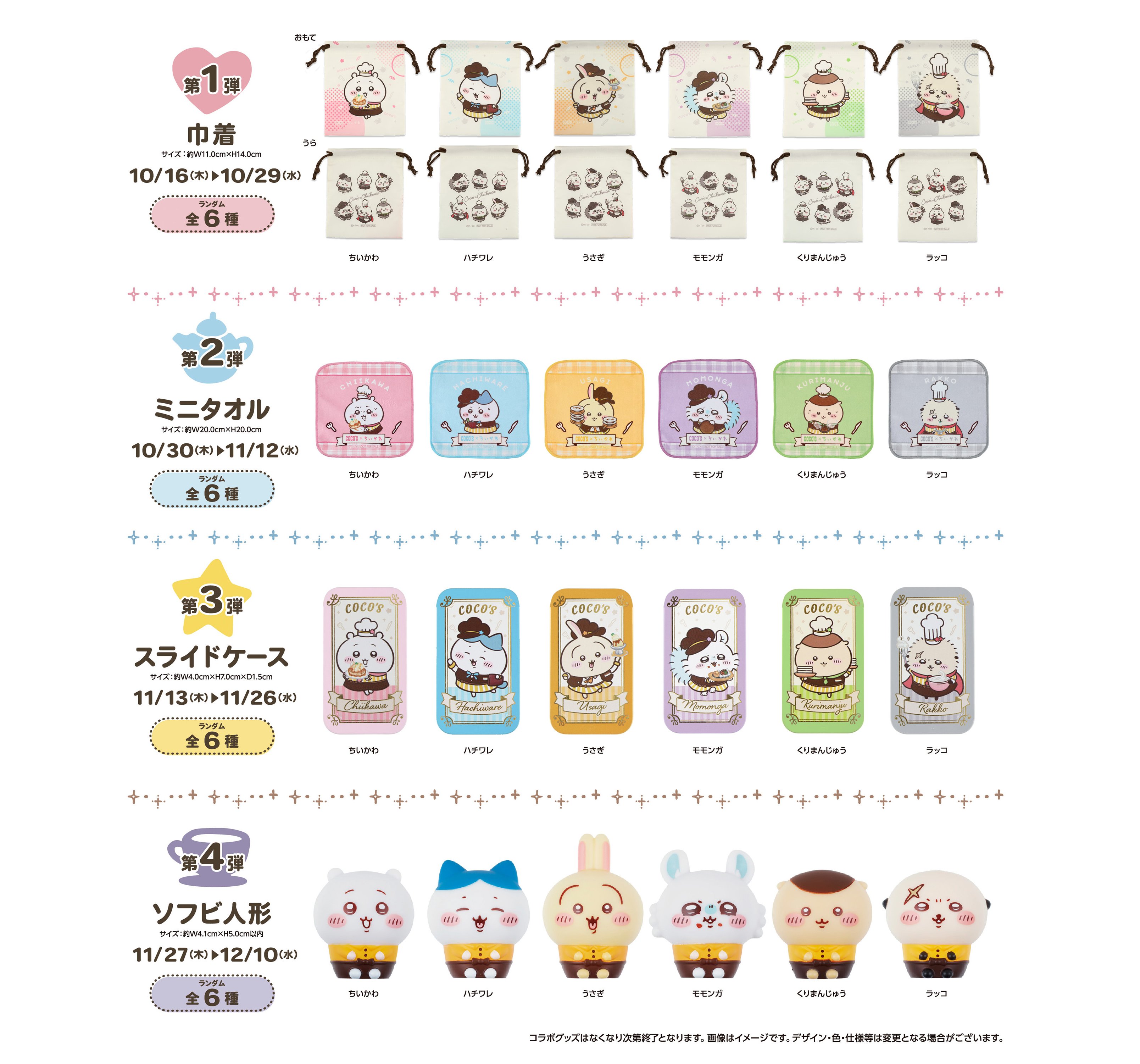 ご紹介した対象メニュー1品の注文につき、数量限定でココス×ちいかわオリジナルコラボグッズを1つプレゼント(ランダム)。配布期間は4期に分かれており、それぞれグッズの内容およびデザインが異なるそうです!