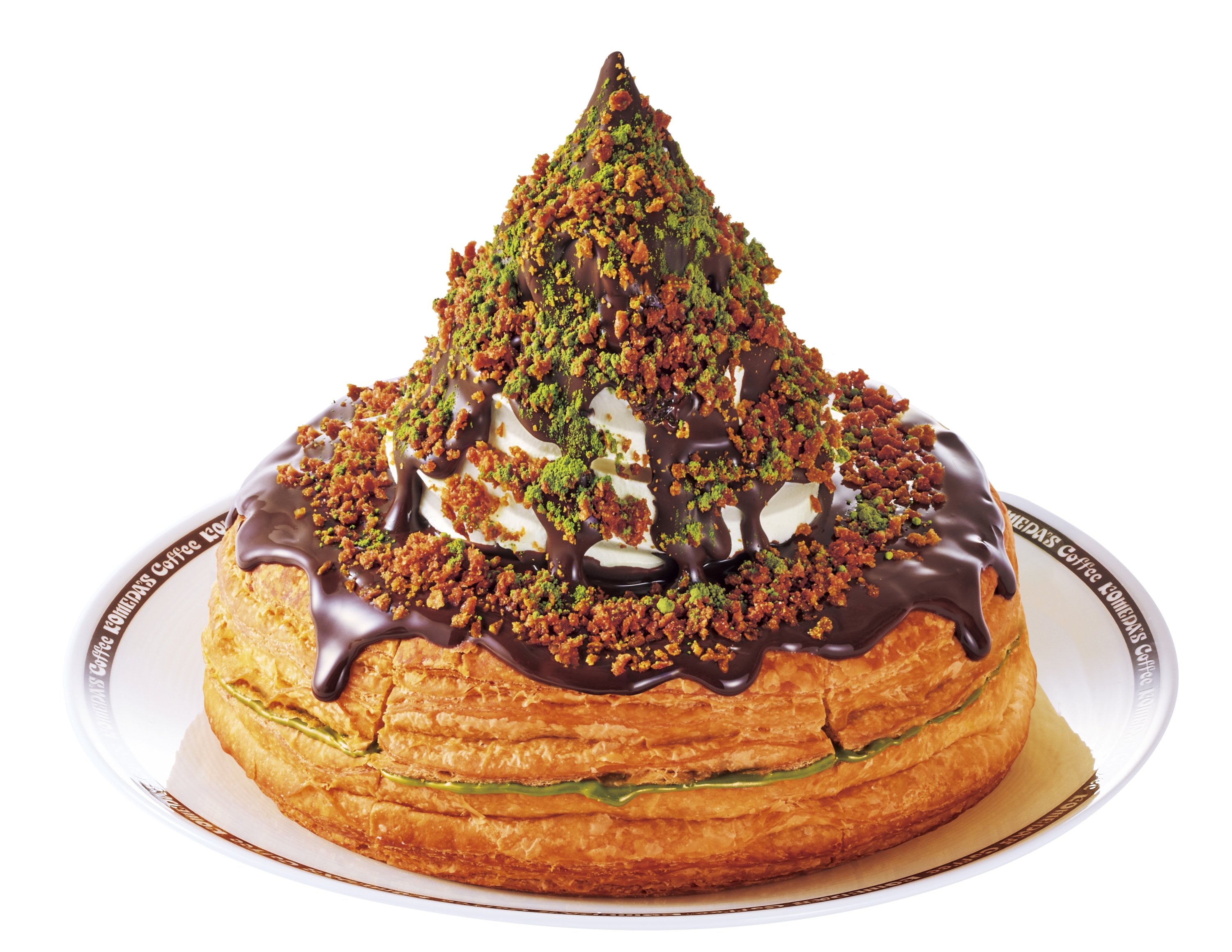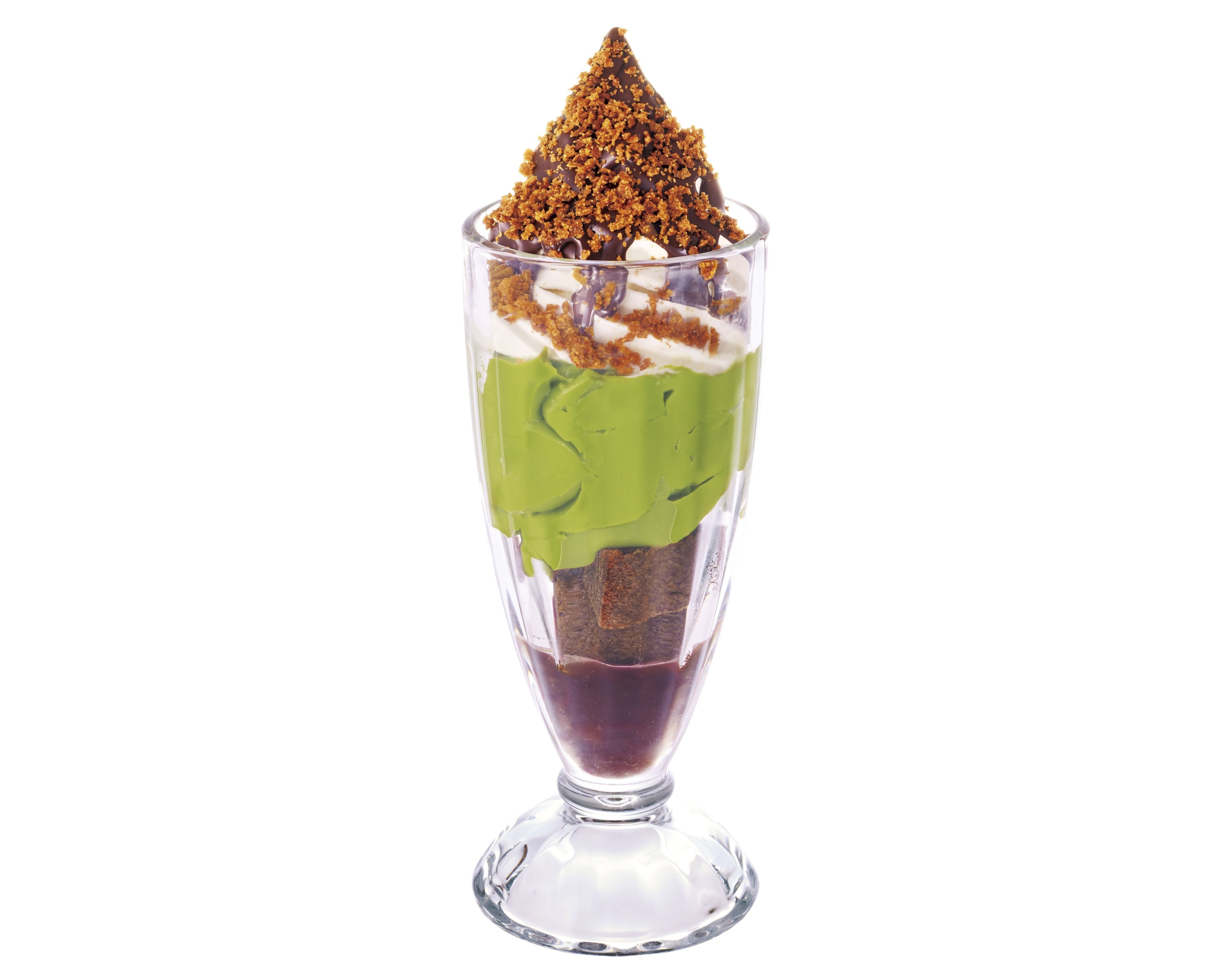 コメダ珈琲店初のパフェが登場! ブラックモンブランを彷彿とさせるパリパリのチョコ×ザクザク食感のクランチで仕上げたソフトクリームの下に、祇園辻利の宇治抹茶を使ったプリン、ココアバウムクーヘンと小倉あんを合わせています。