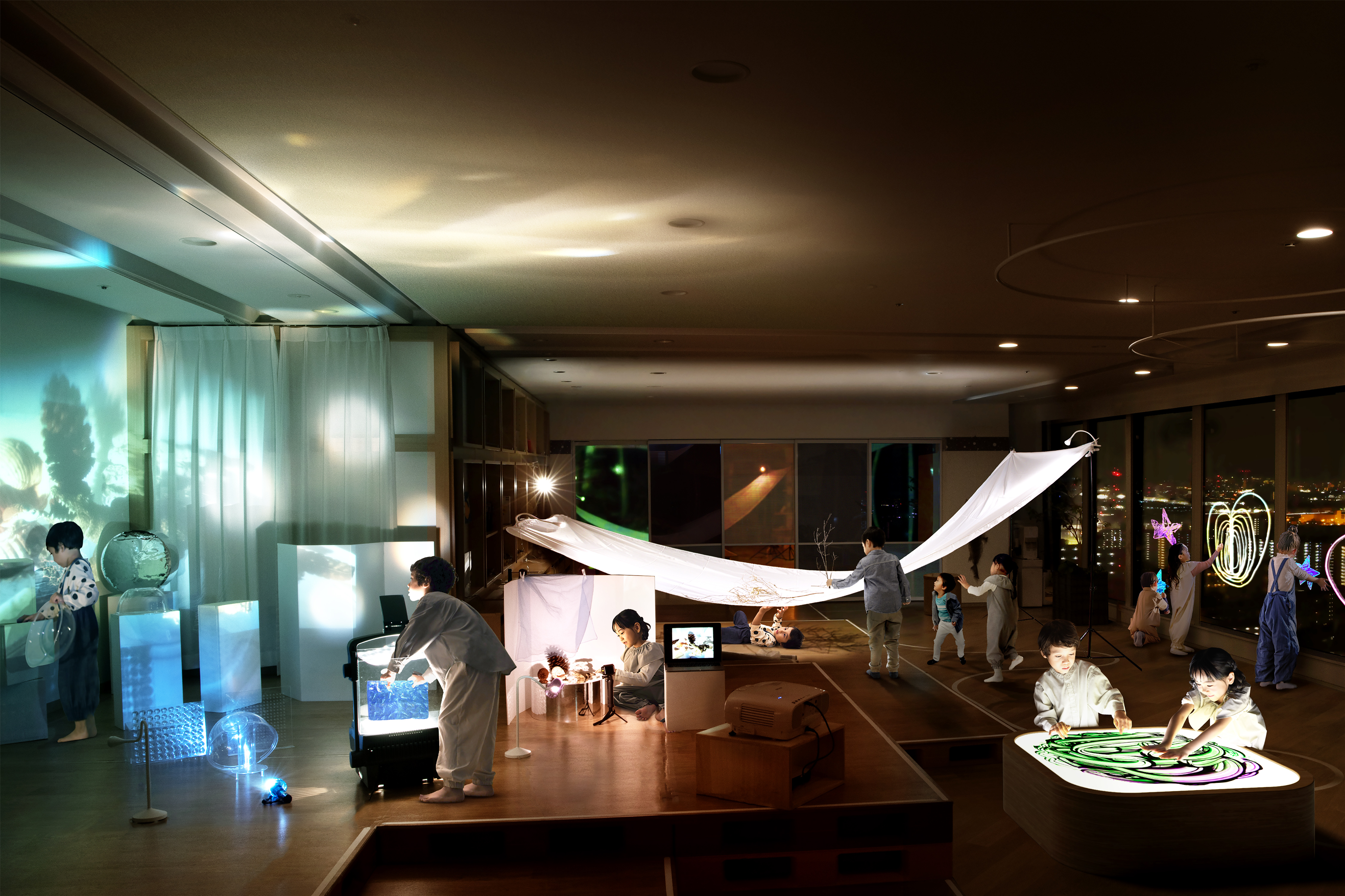 週末限定で開催される特別企画「夜のアトリエ」。水に反射する光、ガラスを通して揺らぐ光、壁に映る影など、光にまつわるさまざまな事象と遊べるキッズイベントです。