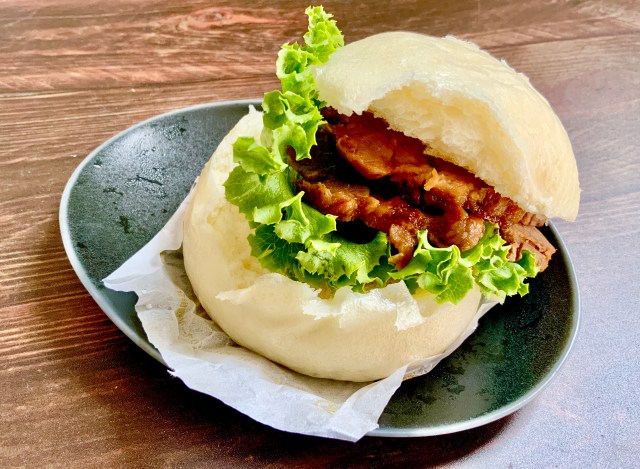 シンプルだからこそ、食べ方のバリエーションは無限に広がりそう。私はためしに、チャーシューとレタスをはさんで「すまんバーガー」を作ってみました。