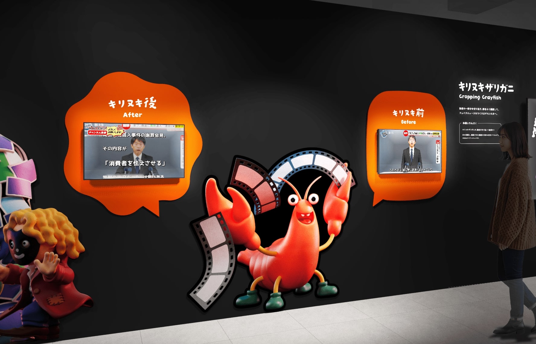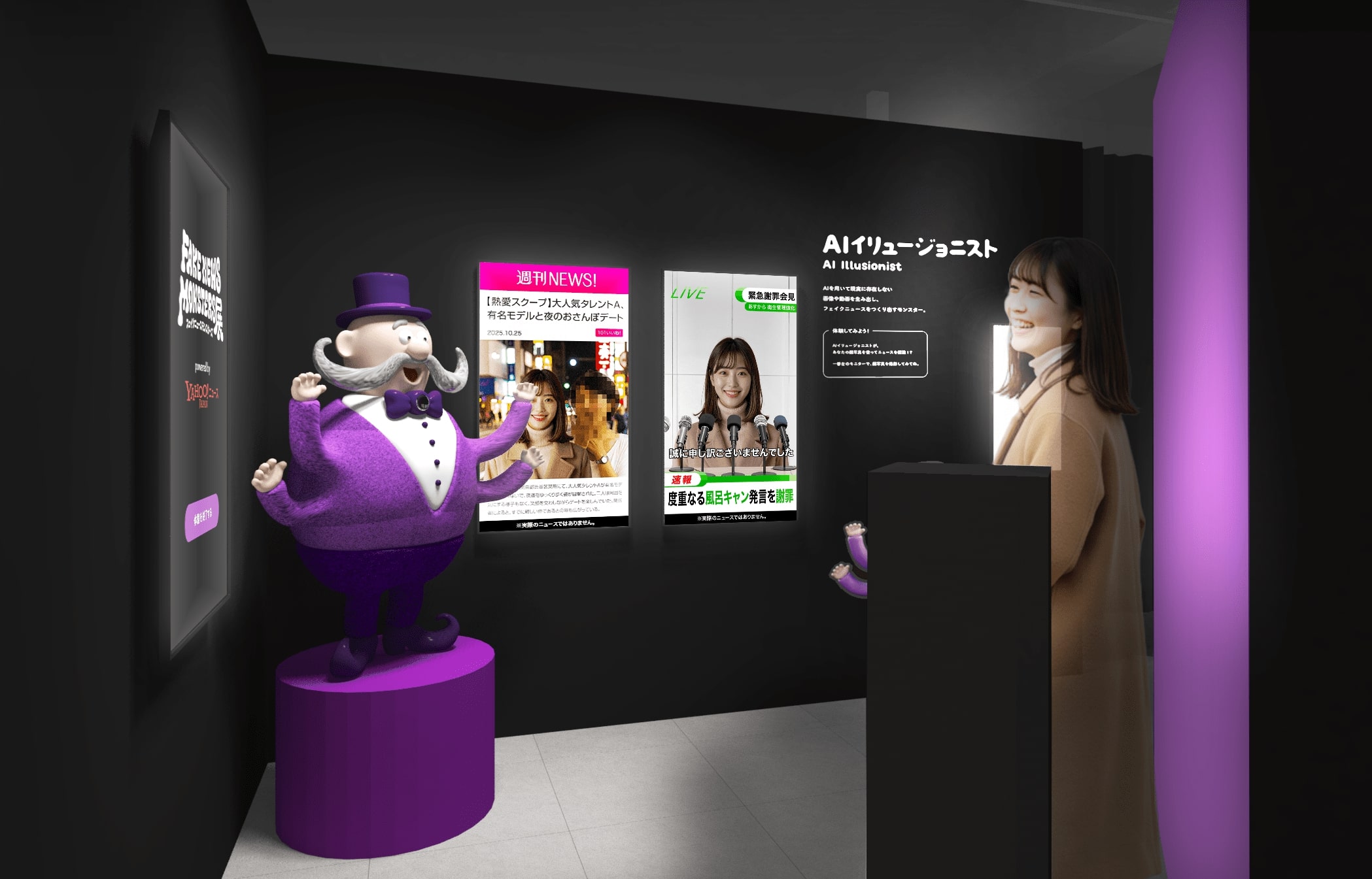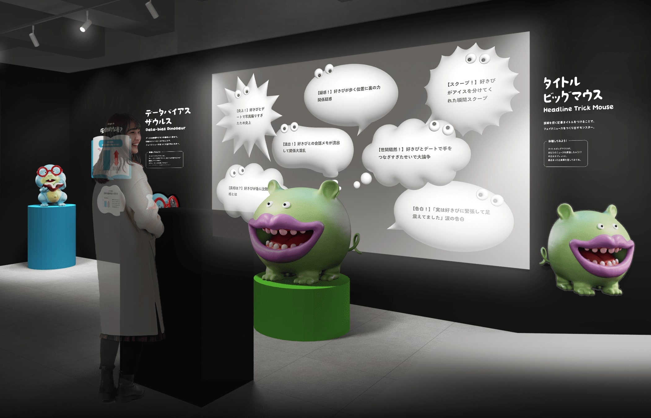 AIを用いて現実に存在しない画像や動画を生み出すモンスター。来場者の写真を使用したウソのニュースがその場で作成され、フェイクニュースをねつ造されてしまうのだとか。