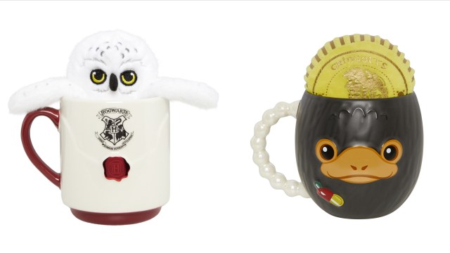 「ホグワーツ入学許可証 マグカップ & ヘドウィグ ぬいぐるみ ギフトセット」(3000円)には入学許可証デザインのマグカップにフワモコなヘドウィグのぬいぐるみ。そして「ニフラー コージー マグカップ & ぬいぐるみセット」(3000円)はニフラーのお顔デザインのカップに、ガリオン金貨のぬいぐるみつき!(ガリオン金貨のぬいぐるみ!?)
