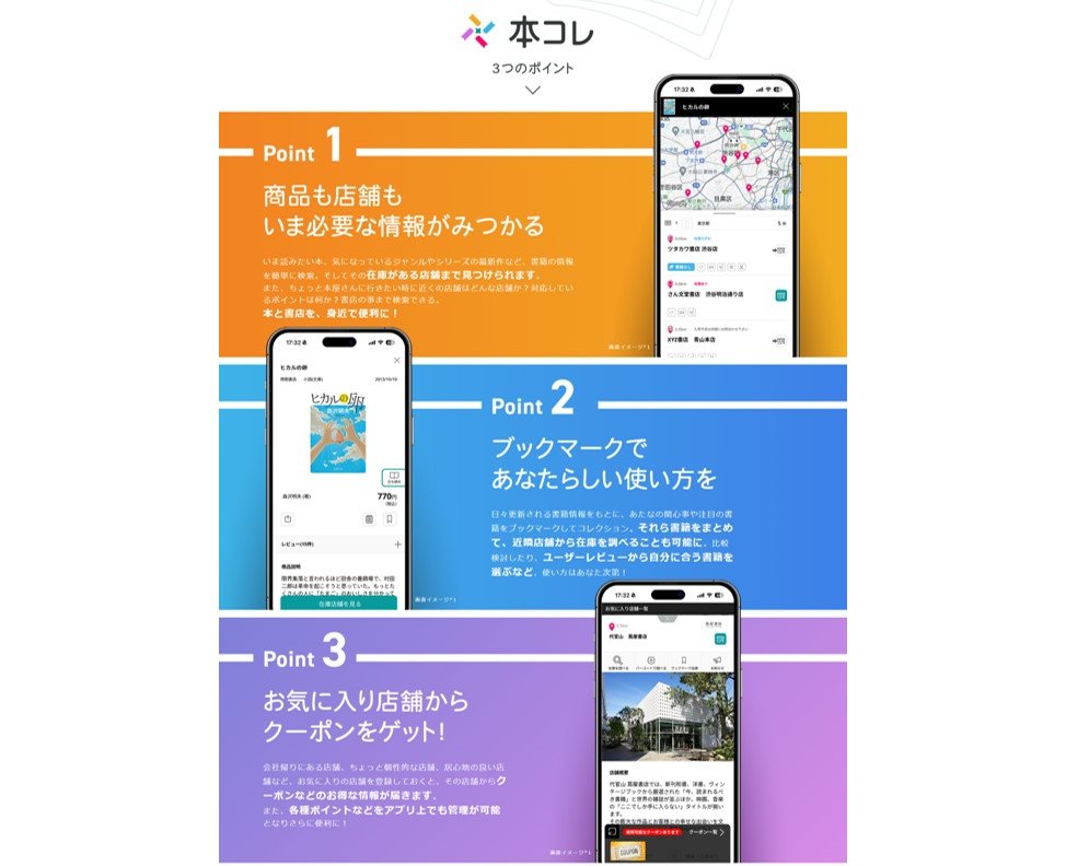 地図や一覧から全国の書店を検索可能。営業時間・取扱ジャンル・イベント情報のほか店舗ロゴなども表示され、お気に入り登録した書店からはクーポンやキャンペーン情報が届きます。
