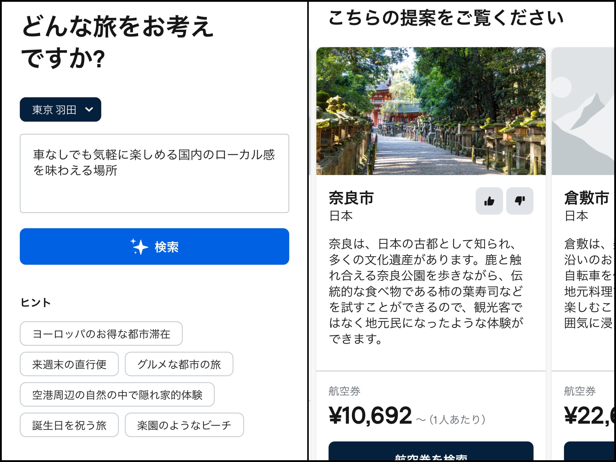 実際に「車なしでも楽しめる国内のローカル感を味わえる場所」と入力して試してみたら、奈良や倉敷を提案してくれました。行き先が決まってないときのヒント探しに使えそう。