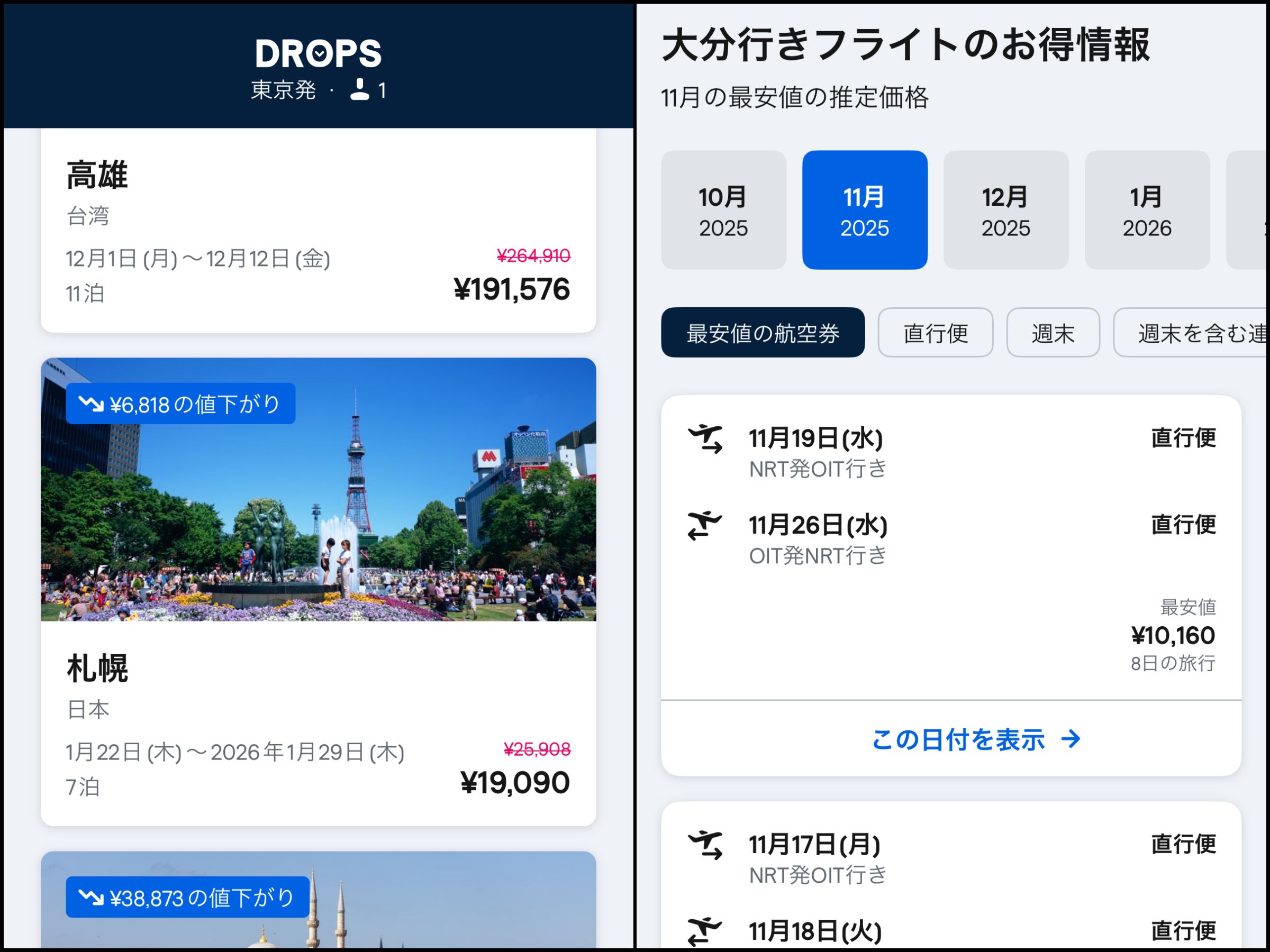直近7日間と比べて20%以上値下がりした航空券を教えてくれるという面白い機能。たとえば札幌行きが6000円以上安くなってる、みたいな情報がアプリに表示されるので、お得なタイミングを逃したくない人にはめちゃ便利!