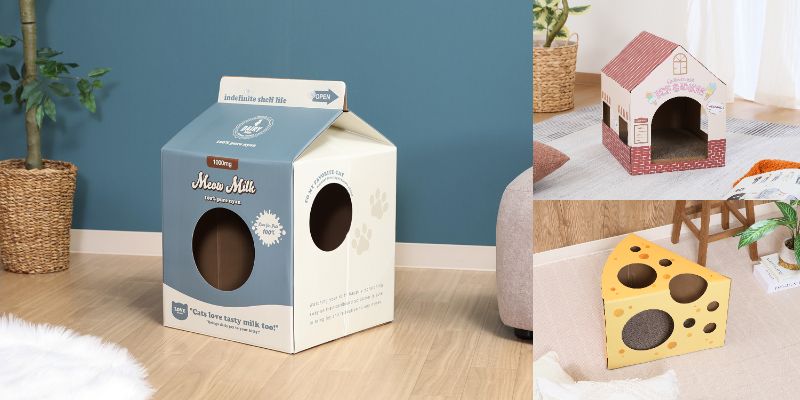 インテリアとしても優秀な爪とぎが勢ぞろい。アメリカンなデザインがかわいいテレビ、缶詰、ランドリー、ロンドンバス、スケボーのほか、牛乳パックやアイス屋さん、チーズといったかたちも!