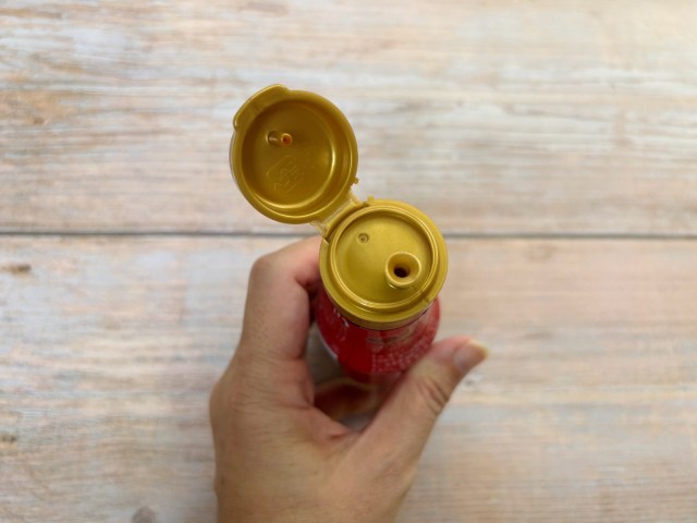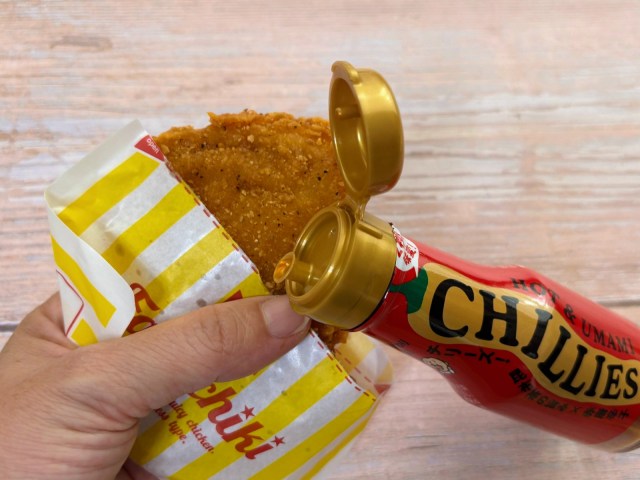まずはその手軽さをたしかめるべく、コンビニチキンにかけてみることに。キャップが片手で開けられる仕様なので、今みたいに片手がふさがっていてもささっとかけることができて便利です♪