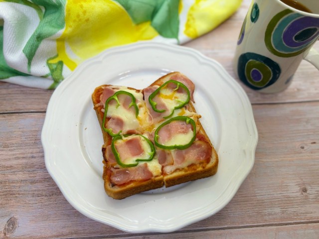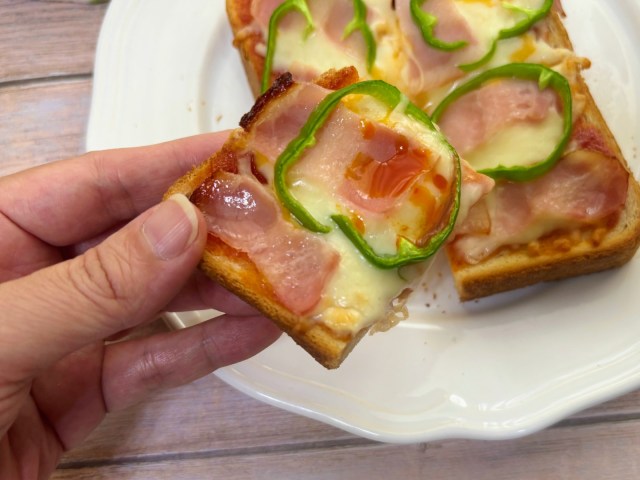 つづいては、チリーズの公式サイトでも「相性抜群」と激推しされていたこちら。ケチャップにベーコン、チーズ、ピーマンと乗せて焼いたシンプルなピザトーストにかけていただいてみます。