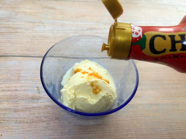 恐る恐る食べてみると……え、これは新鮮。「辛い(ホット)」と「冷たい(コールド)」、「甘い」と「しょっぱい」のコントラストが楽しめて、意外なおいしさを味わえます。もとのバニラアイスから激変するので、チリーズの魅力をいちばん感じ取れるかもしれません。