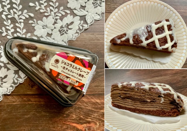 サクサクのパイ⽣地に、ミルクチョコとホワイトチョコの2層のクリームを重ねたミルフィーユ。クーベルチュール規格のダークチョコでコーティングされていて、コンビニとは思えない本格的な味わいです。