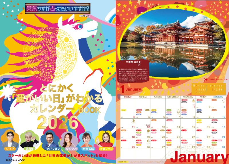 売り切れも続出する最強開運カレンダー。一粒万倍日や天赦日など「運がいい日」がひと目でわかるうえに、番組に登場する人気占い師6名が「世界の運気があがるスポット」をセレクト。2026年の基本運勢やラッキーアイテムも紹介しています。