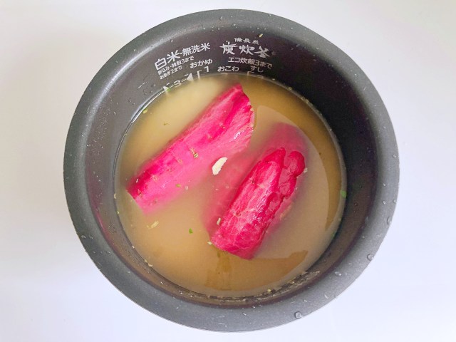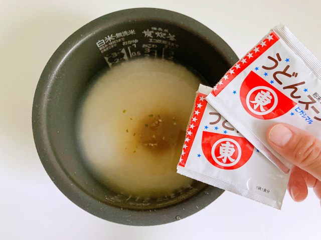 ①お米は普段どおりの水加減で。そこへ「ヒガシマル醤油 うどんスープ」1袋を投入します。