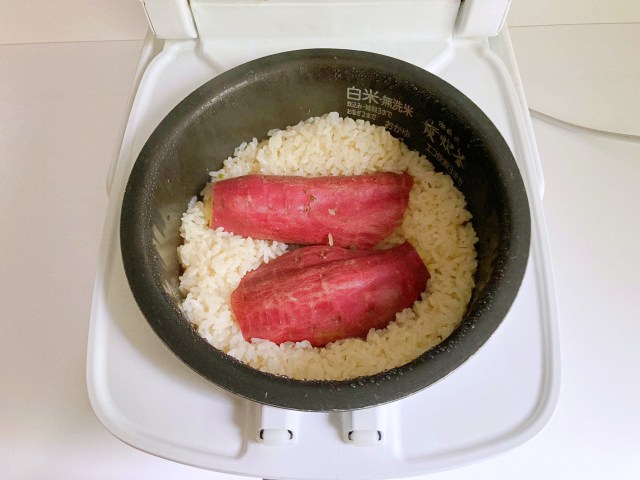 よく洗ったさつまいもは、輪切りやサイコロ状にせず、皮ごとそのままでOK。今回は1本で300gあったので炊飯器に入りきらなかったので半分にカットしました。1本150g前後だと切らずに入ると思いますっ。