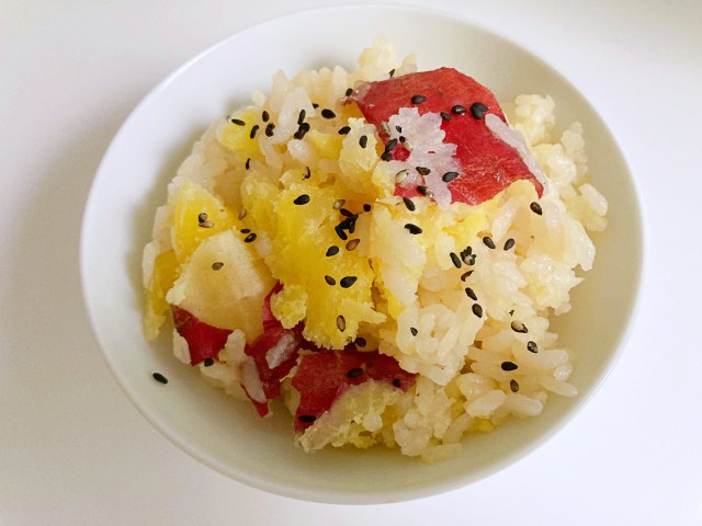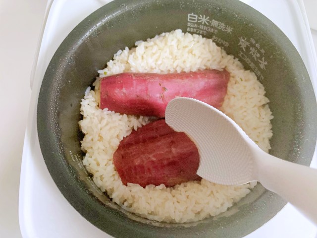 いつもの炊飯タイムで完成。炊飯器の蓋を開けてみると、湯気の中からお芋さんがコンニチワ!