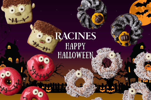 生クリームが詰まった四角いブリオッシュ生地の表面をピスタチオとホワイトチョコレートを合わせたチョコでコーティングした「フランケン」。クランチの髪、ピスタチオの鼻、チョコペンの縫い目などで、ちょっぴり怖いけどユーモラスなところもたまりません! ほかにも、黒×オレンジの大人なフレンチクルーラー「ブラックパンプキン」、表情豊かなモンスターを3パターンで楽しめる「フランボワーズモンスター」、目玉がひとつのおばけ「ココナッツモンスター」と自信作ぞろい♪