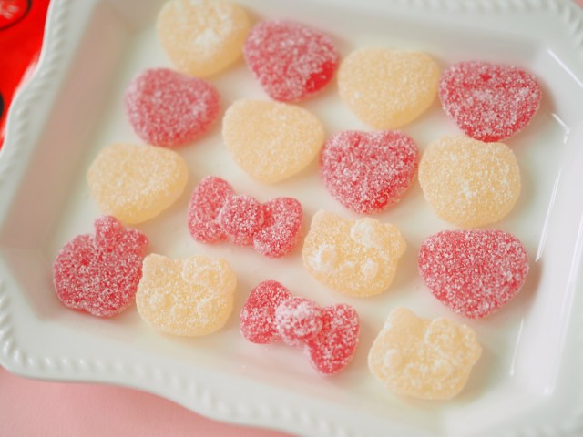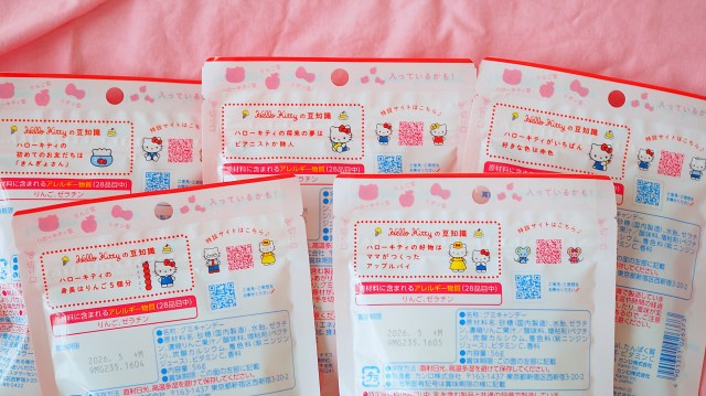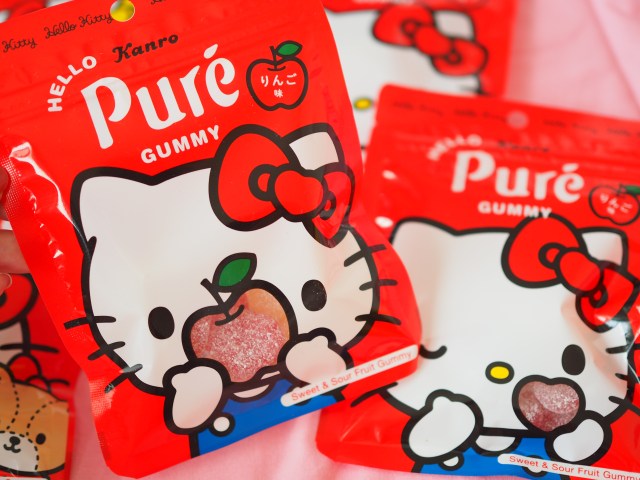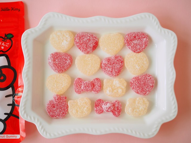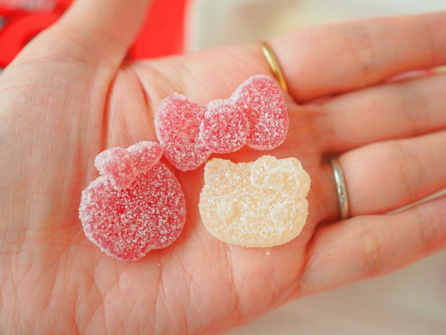 ピュレグミの定番ハート型はもちろん、ハローキティ型、リボン型、りんご型の特別なピュレグミも入っているのでぜひ探してみて! レアな3つの形はどれも立体的でかわいすぎるのですが、特にキティちゃんのお顔は小さなリボンや目などもバッチリわかるほど再現度高めです……!