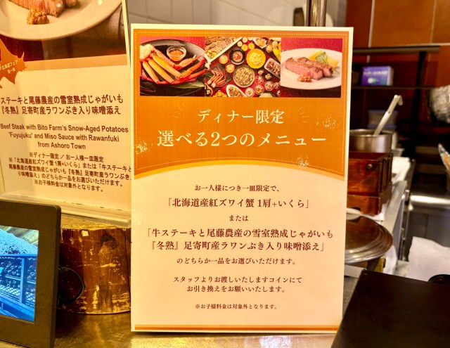 ディナーでは「牛ステーキと尾藤農産の雪室熟成じゃがいも『冬熟』足寄町産ラワンぶき入り味噌添え」もしくは「北海道産紅ズワイ蟹 1肩+いくら」が選べます。