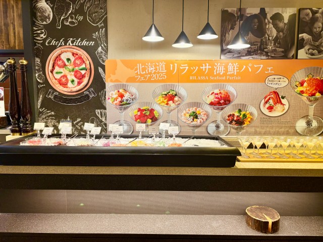 ディナー限定の「リラッサ海鮮パフェ」は、北海道フェアらしく鮪、鮭、甘えび、いかオクラなど10種類を超える食材が選べる豪華仕様に♡