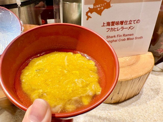 出来立てを提供していただける「上海蟹味噌仕立てのフカヒレラーメン」(ディナー限定)も贅沢すぎる……! とろみのあるスープは涼しい日に体を温めてくれます。