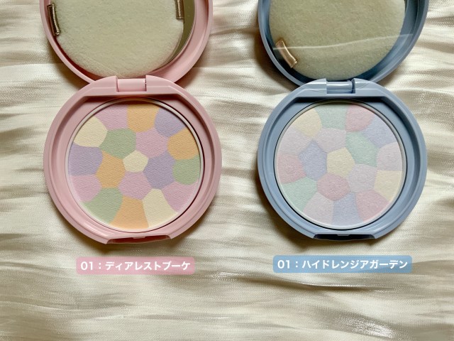 ちなみに中身はいつもと同じ。「マシュマロフィニッシュパウダー ~Abloom~」の中身はくすみ補正とトーンアップを叶えてくれる「01:ディアレストブーケ」、「イルミネイティングフィニッシュパウダー ~Abloom~」の中身はラベンダーカラーで透明感をアップしてくれる「01:ハイドレンジアガーデン」です。