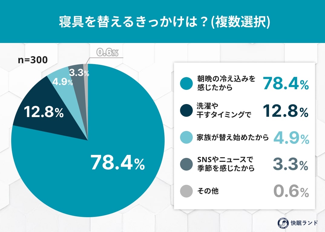 今回の調査において、寝具を替えるきっかけとしてもっとも多かったのは「朝晩の冷え込みを感じたから」(78.4%)。約8割もの人々が “体感温度” をきっかけに行動していることがわかります。