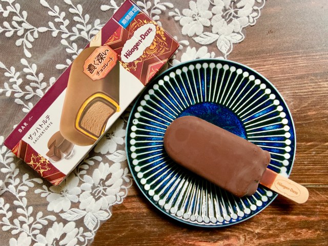 ハーゲンダッツ バー「ザッハトルテ」は名前の通り、チョコレートケーキにアプリコットソースをはさんだオーストリア発祥のスイーツ「ザッハトルテ」から着想を得たフレーバー。見た目はチョココーティングのアイスバーで、そこまで濃厚なのかどうか分かりにくいのですが……